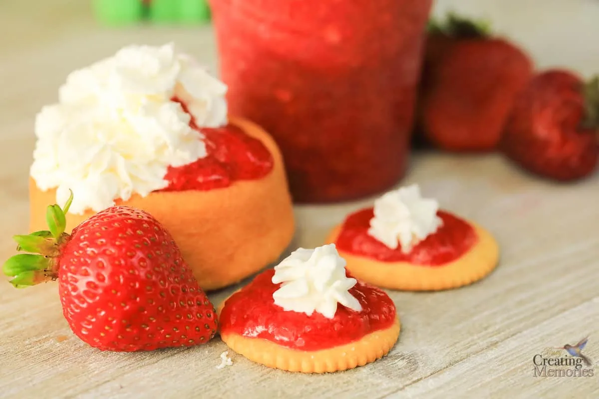 One thing that I absolutely love about this easy no-cook strawberry freezer jam recipe is that it has so many ways to use it! Because it’s not cooked it tastes amazing on foods that you would normally pair with fresh strawberries.