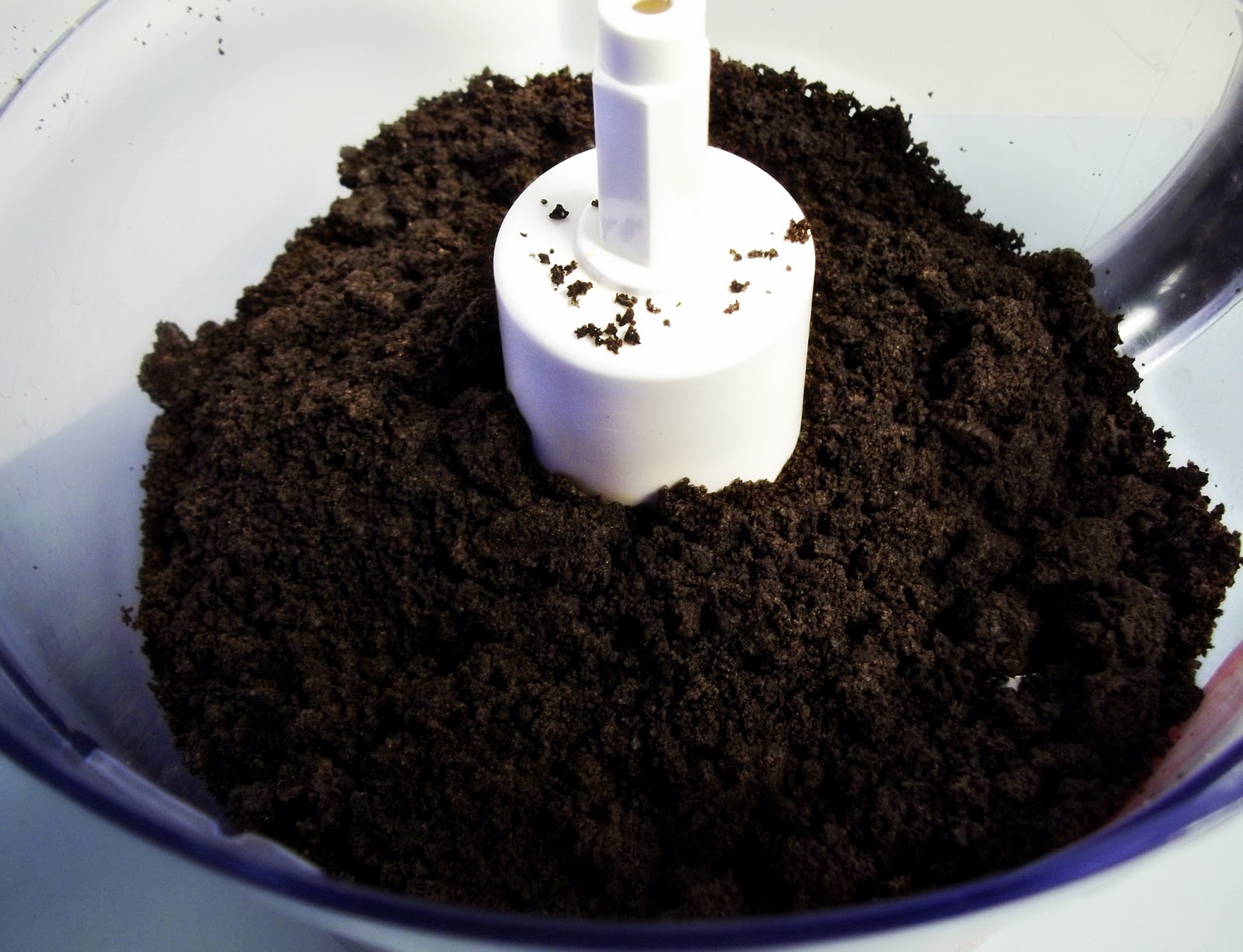 Crush all the oreos into a fine crumble. I love using the food processor for this, as it does it quickly and I can be sure there aren’t any large chunks left. It should look like this:
